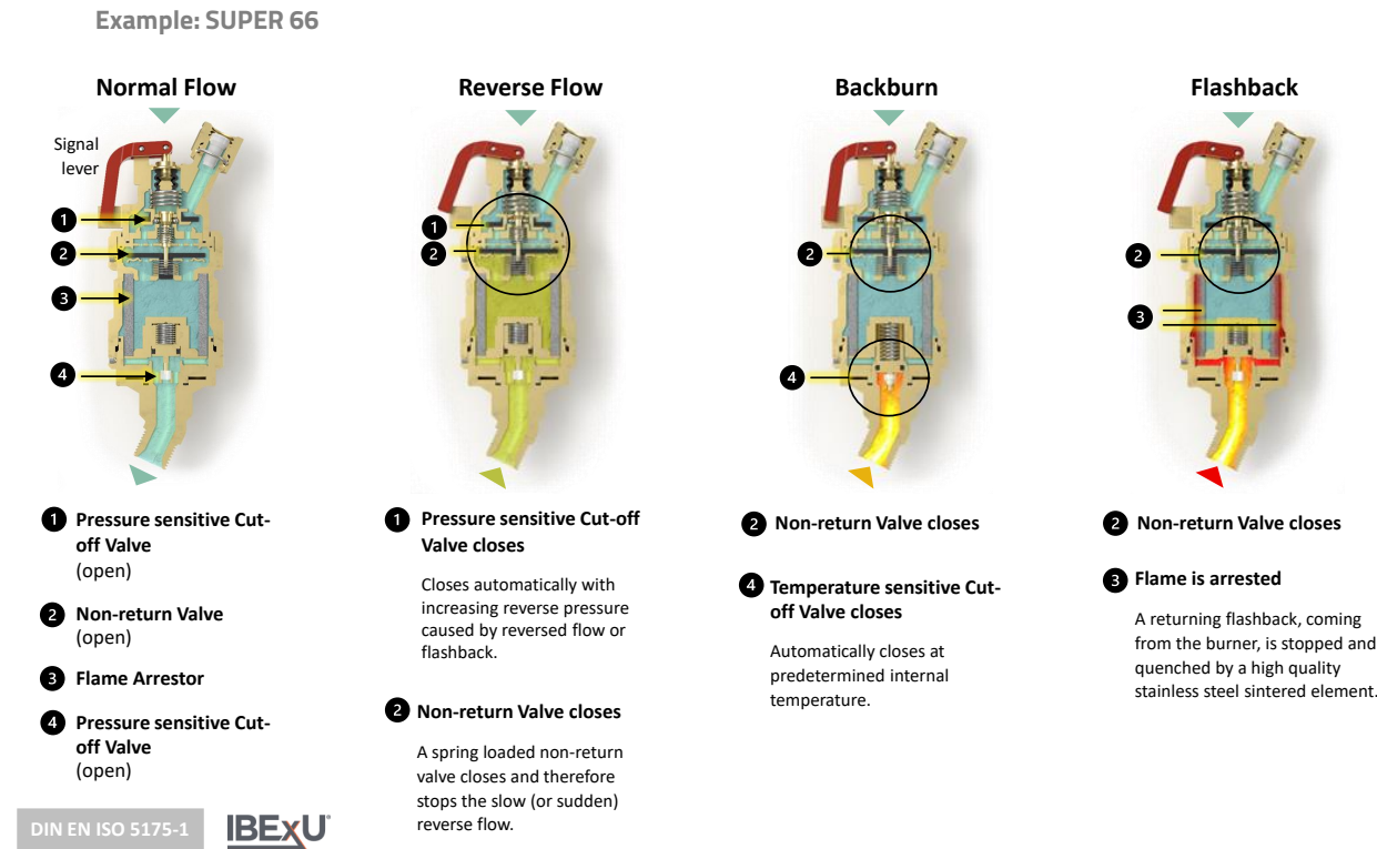 국제 규격 DIN EN ISO 5175에 따라 설계된 장비는 국내 KOSHA 인증도 있으며 역류, 화염, 고온, 고압, 폭발 등 복합적인 위험요소를 자동으로 차단할 수 있도록 구성되어 있습니다.
