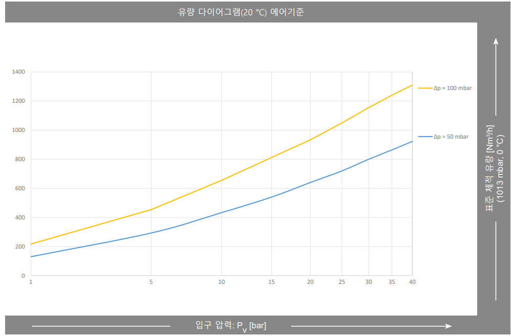 | 입구 압력 40 bar, Δp 100 mbar | 약 1,400 Nm³/h (에어 기준) |
