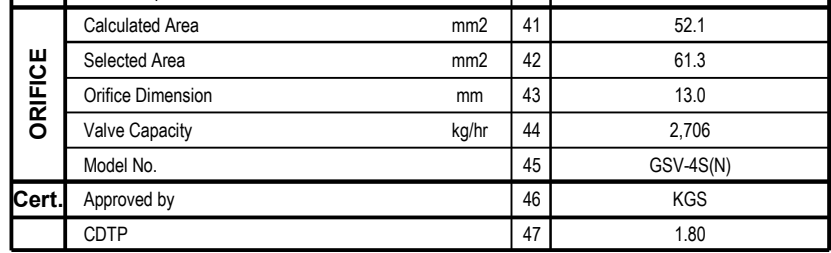 - Calculated Area(A1): 52.1 mm² (계산 면적) ▶▷ 7.3에서 계산 한 오리피스 면적(소요 분출량을 만족하는 값)
