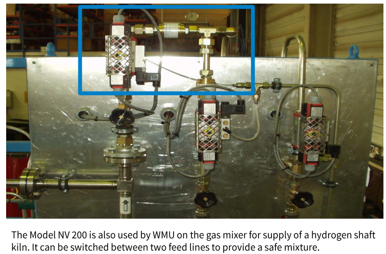 수소 샤프트 킬른용 가스 믹서에서는 2개 공급라인 전환 시 안전한 혼합비 유지를 위해 각 라인에 NV200을 설치합니다.