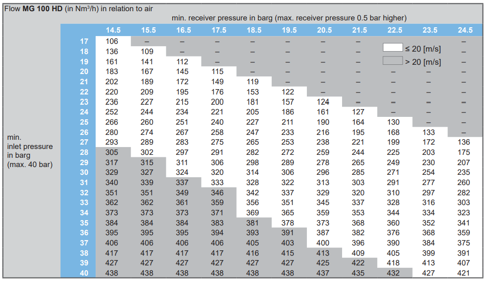 MG 100 HD 유량 데이터 (Nm³/h, 공기 기준)