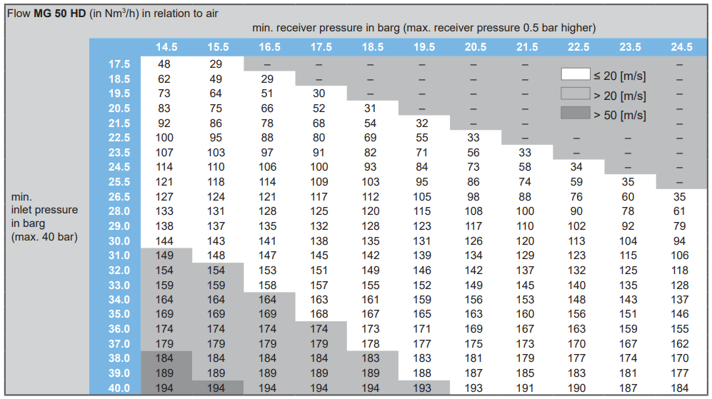 MG 50 HD 유량 데이터 (Nm³/h, 공기 기준)