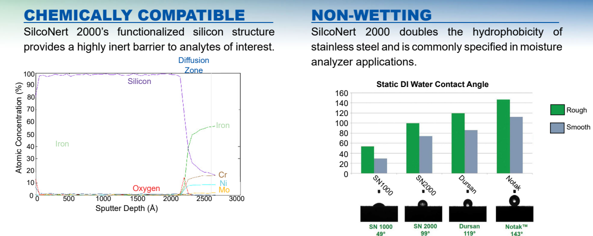 - SilcoNert 2000은 물방울이 구형을 유지할 정도로 소수성이 향상되어, 수분 분석기기, 반도체 공정, 저수분 환경에서의 정밀 분석에 매우 적합합니다.