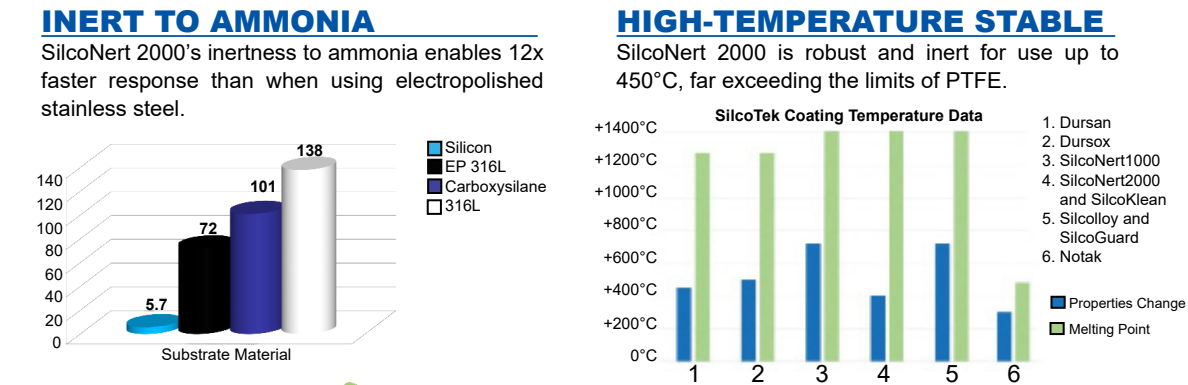SilcoNert 2000은 일반 스테인리스강 대비 약 12배 빠른 응답속도를 제공하며, 암모니아에 대해 극도로 낮은 흡착성을 나타냅니다. 이는 암모니아가 주요 분석 대상인 환경에서 매우 유리합니다.