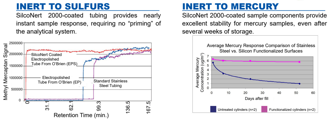 이 두 그래프는 SilcoNert 2000이 고활성 가스 성분에 대해 뛰어난 비흡착성과 장기 안정성을 제공하는 코팅임을 명확하게 보여줍니다. 실험실 및 산업 현장에서 재현성 있는 분석 결과가 필수일 때, 매우 유용한 솔루션입니다